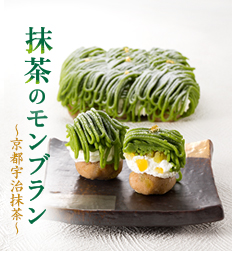 和のきんとんの上に、栗の刻みをちりばめたホイップクリームを重ねて、抹茶あんをたっぷりとしぼりました。薫り高い"京都宇治抹茶"で仕立てた「抹茶のモンブラン」です。