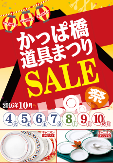 合羽橋キャニオンでは、年に一度の「かっぱ橋道具まつりセール 2016」を10月4日(火)~10月10日(祝・月)まで開催いたします。