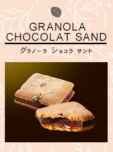 グラノーラショコラサンドは、グラノーラ・クッキーで、ベリーソースを包んだチョコレートをサンドした、はじまりのお菓子グラノーラ・スイーツです。