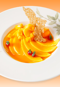 宮崎マンゴーの黄金色の果肉とソルベ、