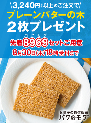 ご自宅届けの方限定で、3,240円(税込)以上ご注文いただいたお客様に、「プレーンバターの木お試しセット(2枚)」を、先着8969(パクモグ)セットプレゼントいたします。