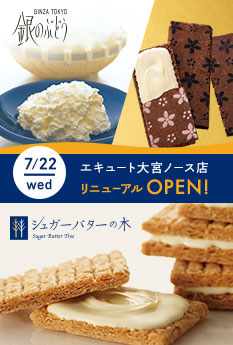 7⽉22⽇(⽔)「エキュート⼤宮 ノース」開業と同時に⼤型セレクトショップ「銀のぶどう・シュガーバターの⽊」として、リニューアルオープンいたします。
